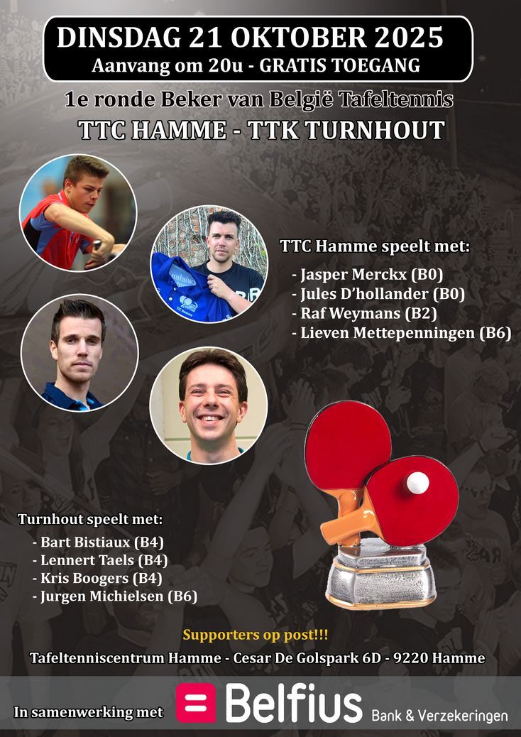 Op dinsdag 21 oktober speelt Hamme tegen Turnhout (ploeg van 3e nationale) voor de beker van België.